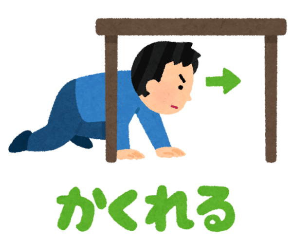 もし、近くに隠れられるものがなければ、倒壊リスクの高いものやガラスなどから離れ、姿勢を低くし、頭を荷物などで守ります。