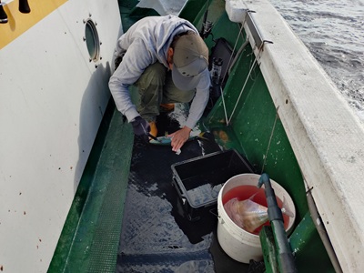 美味しく頂く為に血抜きや脳〆を行い冷やした海水の中へ、美味しく頂きましょう!