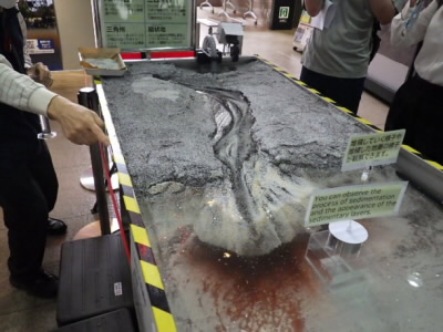 )や河川からの堆積物が粒径によってどうのように堆積していくか観察できる実験装置、地震の観測について、様々な鉱物や岩石の標本などが展示されていました。