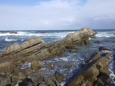 午後からは、福島県のホテルに向かう途中の公園でクリノメーターを用いた歩測ルートマップ作成実習と海岸の地層(後期白亜紀 那阿湊層群磯合層)を観察しました。コンクリートかと思うような礫岩と様々な粒径の砂岩の互層が観察できました。