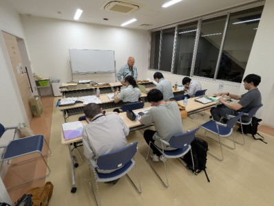 ホテルに到着し、夕食後は近くの公民館でルートマップや観察した地層のデータをまとめました。