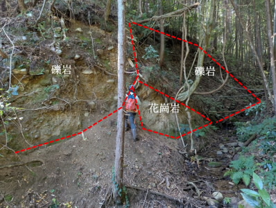 岩石の種類やクリノメーターで走向傾斜の測定と表記方法、ルート調査の内容、地質図・地質断面図の書き方等を学びました。