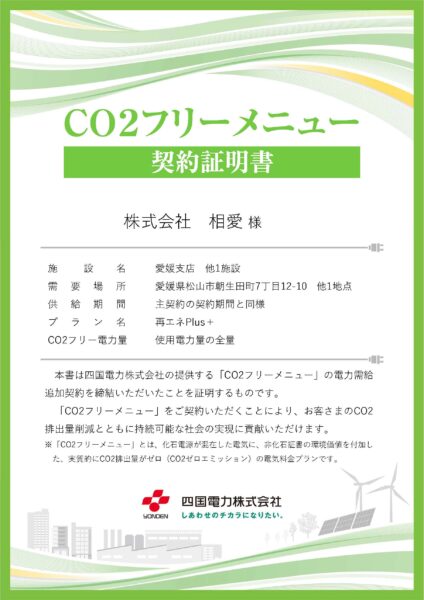 相愛では、令和6年5月1日より本社(高知市重倉)において、グループ企業「株式会社グリーン・エネルギー研究所」が発電する木質バイオマス電力を活用し、四国電力の「再エネ100%プラン」を通じて再生可能エネルギーの利用を開始しております。